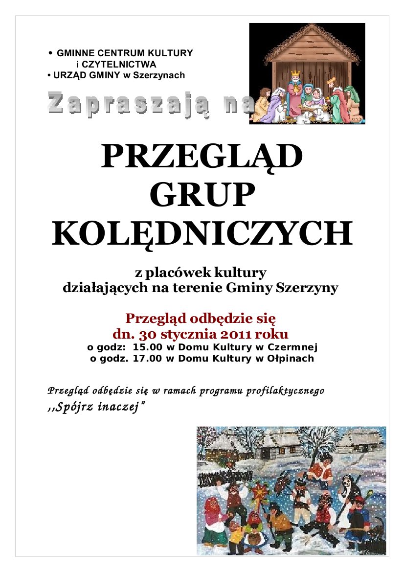 Gminne Centrum Kultury i Czytelnictwa oraz Urząd Gminy w Szerzynach zapraszają na Przegląd Grup Kolędniczych z placówek kultury działających na terenie Gminy Szerzyny.